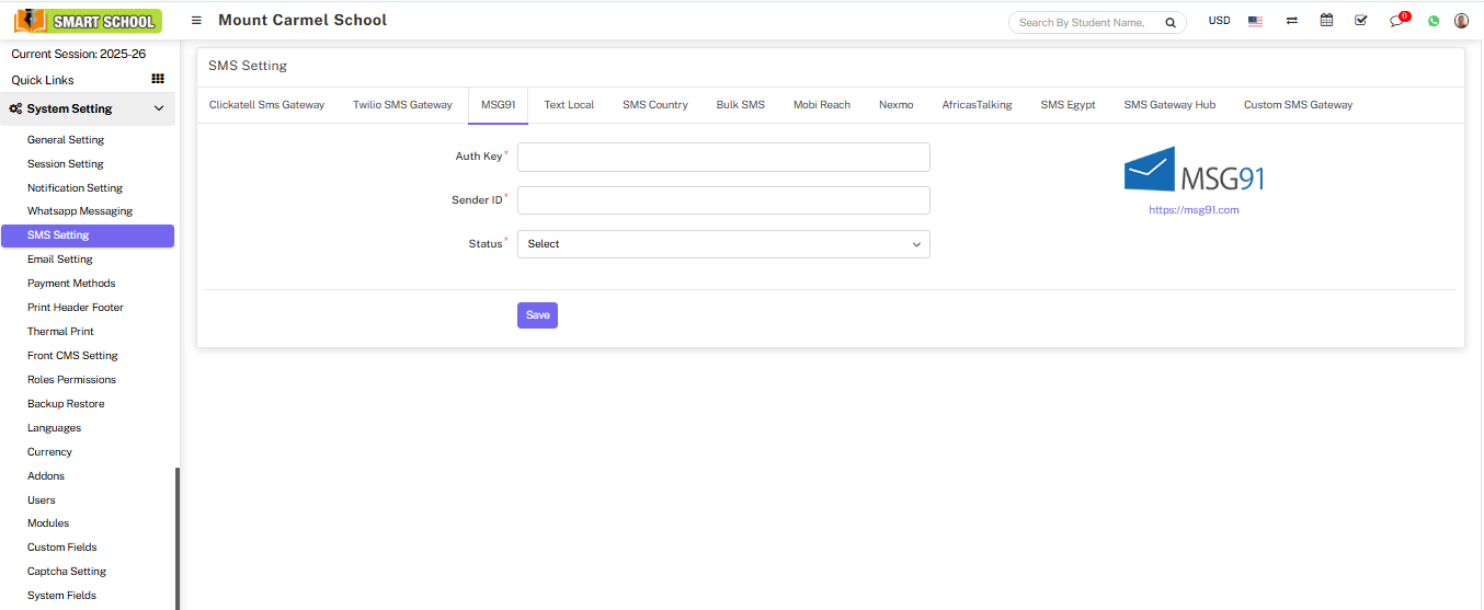 Here we are providing 11 SMS Gateway namely Clickatell SMS Gateway, Twilio SMS Gateway, MSG91, Text Local, SMS Country, Bulk SMS, Mobi Reach, Nexmo, AfricasTalking, SMS Egypt, Custom SMS Gateway in our Soft School.