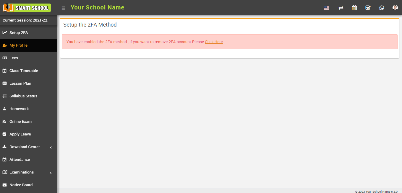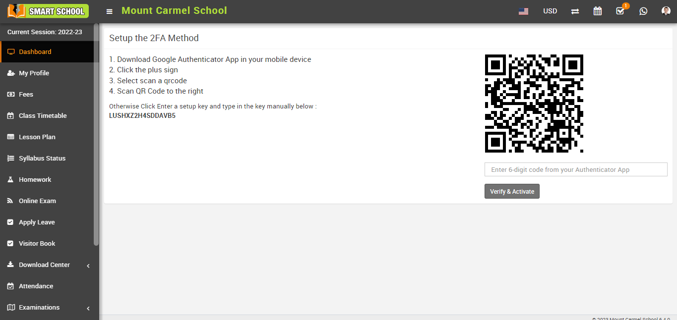 Now, open the Soft School user login, navigate to the User Profile Image in the top right corner, and then click on Settings. The Setup 2FA page will now open; please fill in the six-digit verification code that receive on your mobile device in the left column, below the QR code, and click on Verify & Activate.