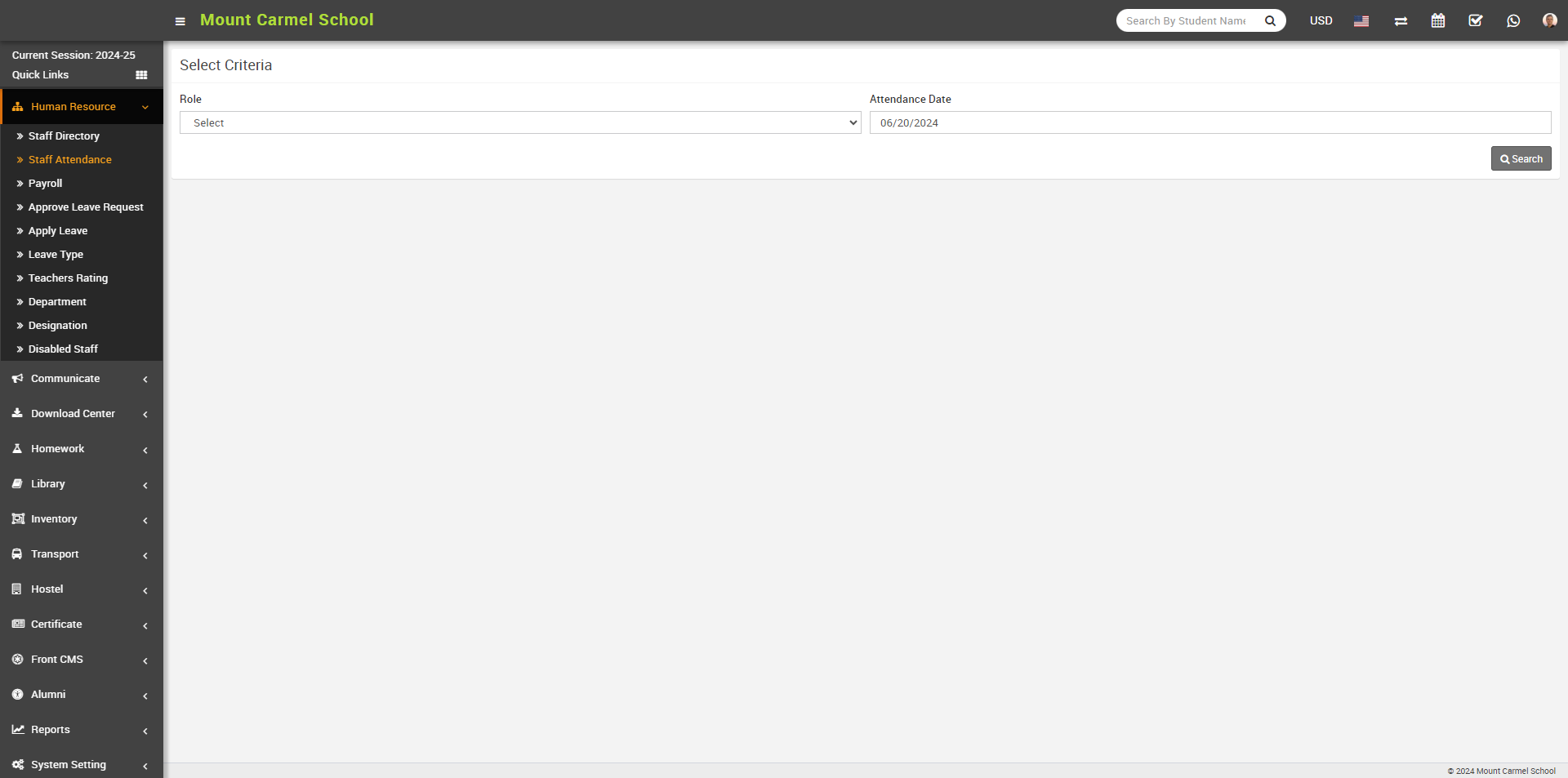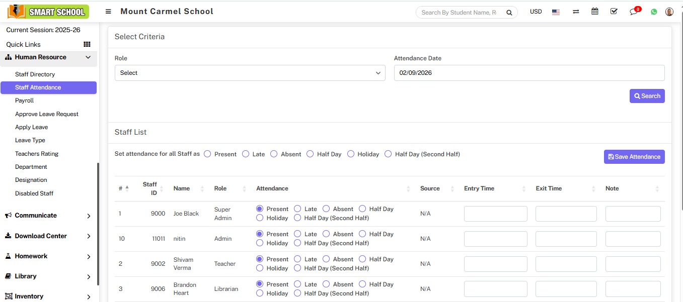 Here select Role and Attendance Date and then click on Search button. The list of staff will be shown in below of the page.