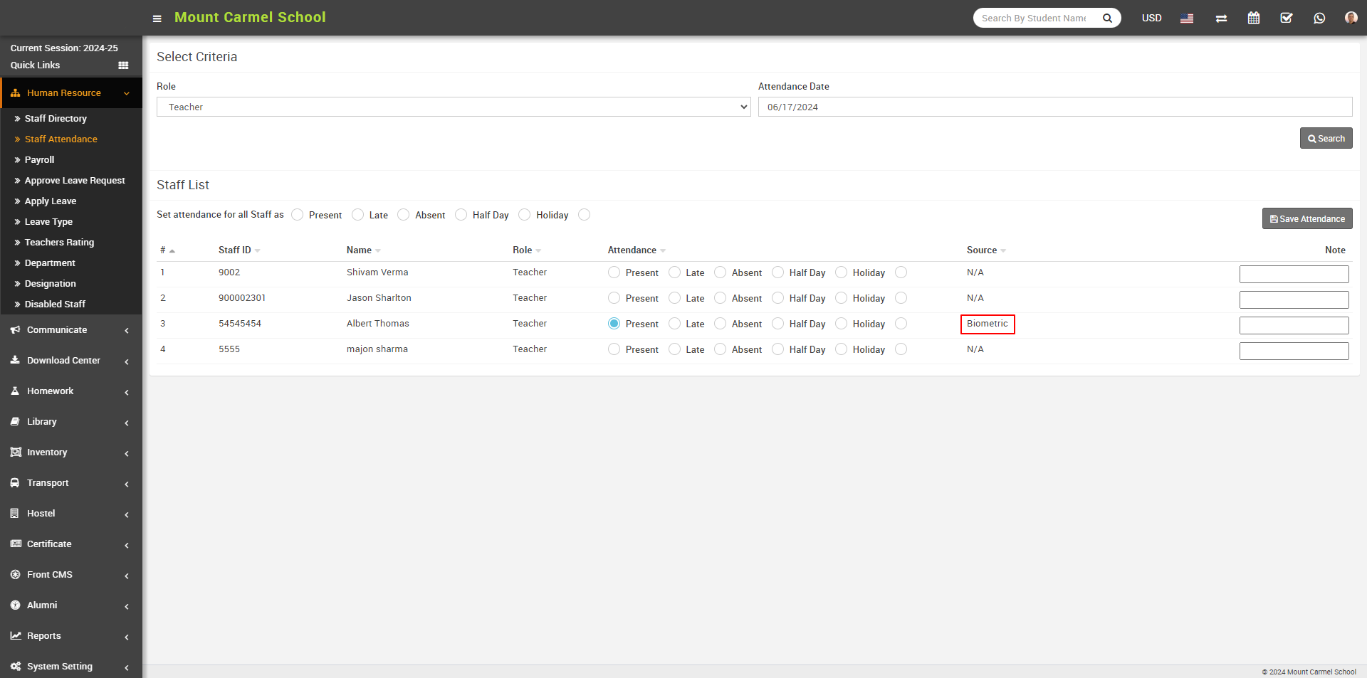 Staff attendance is successfully marked. If you want to verify it, simply go to the Human Resources > Staff Attendance page. There, you will see 'Present' in front of the staff names, and in the 'Source' column, you can see the type of attendance through which it has been marked, such as 'Biometric'