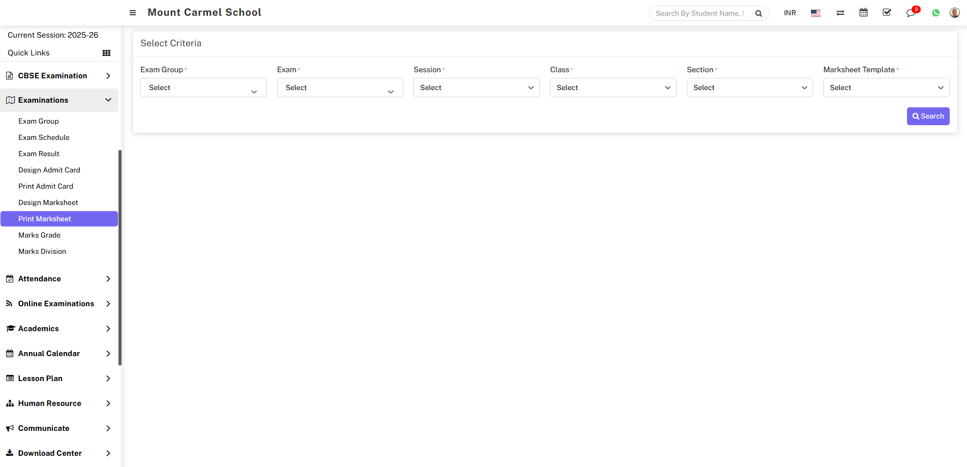 Now select the Exam Group, Exam, Session and Class, Section and Marksheet Template and click on the Search button. The Student List will be displayed below.