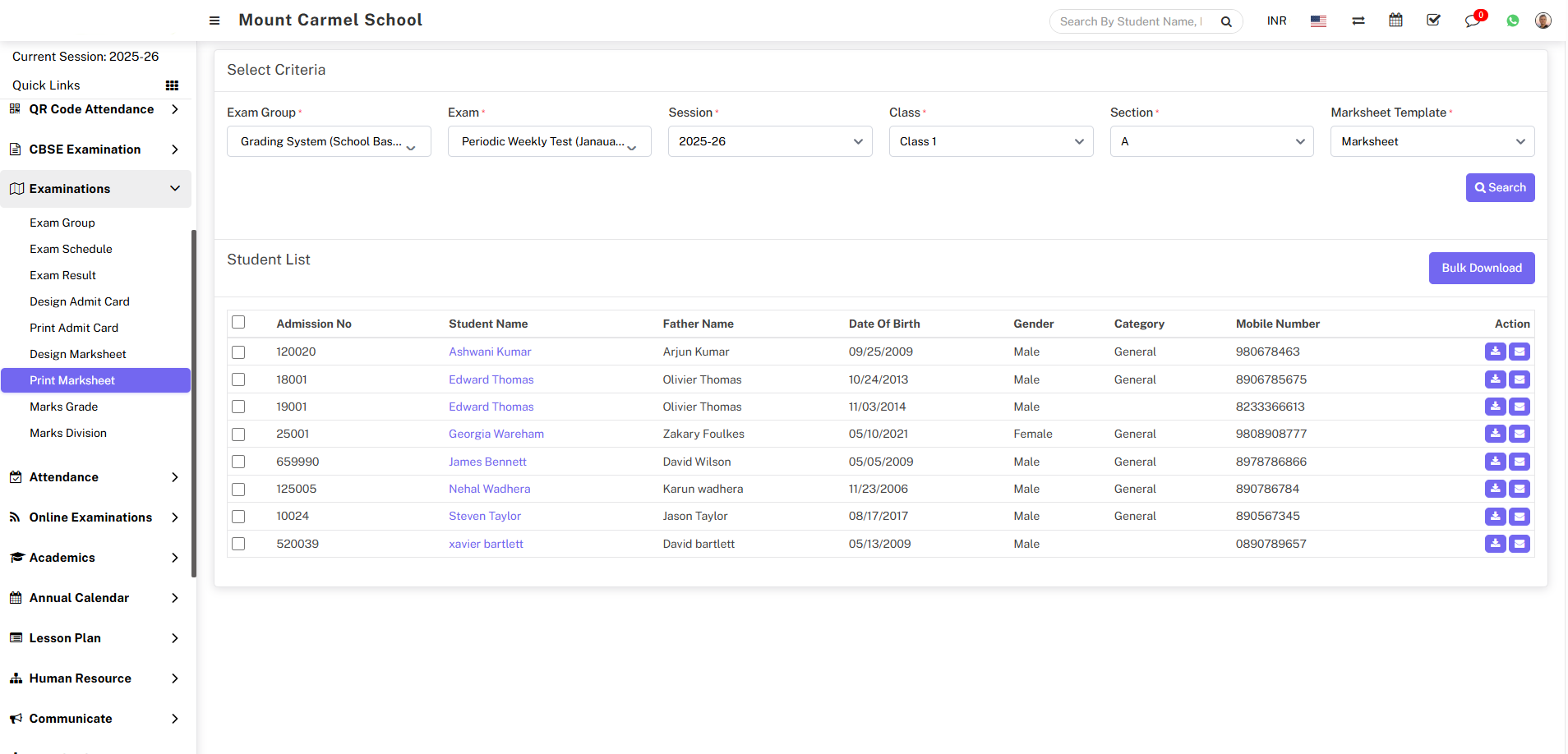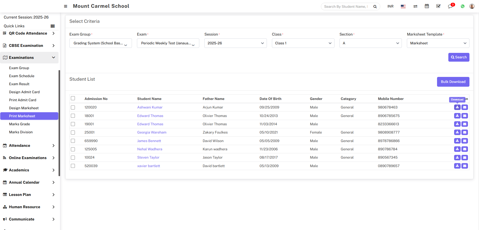 Here you can download the marksheet for an individual student or in bulk. To download the marksheet for a specific student, go to the Action column and click on the Download icon. The marksheet for that student will be downloaded to your system.