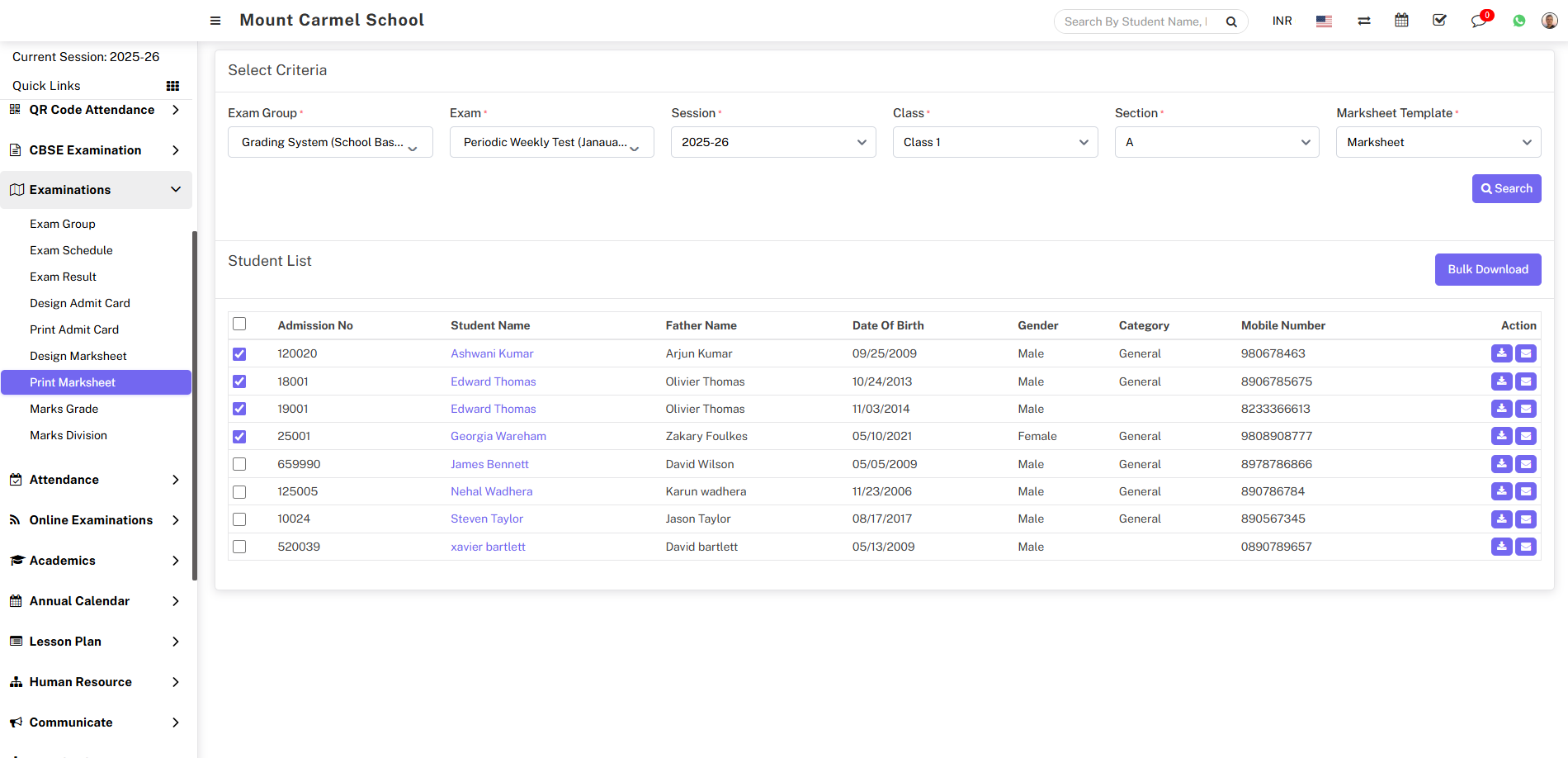 To download multiple marksheets, check the multiple or all checkboxes and click on the Bulk Download button, which is located right above the student list. This will download a bulk marksheet into your system.