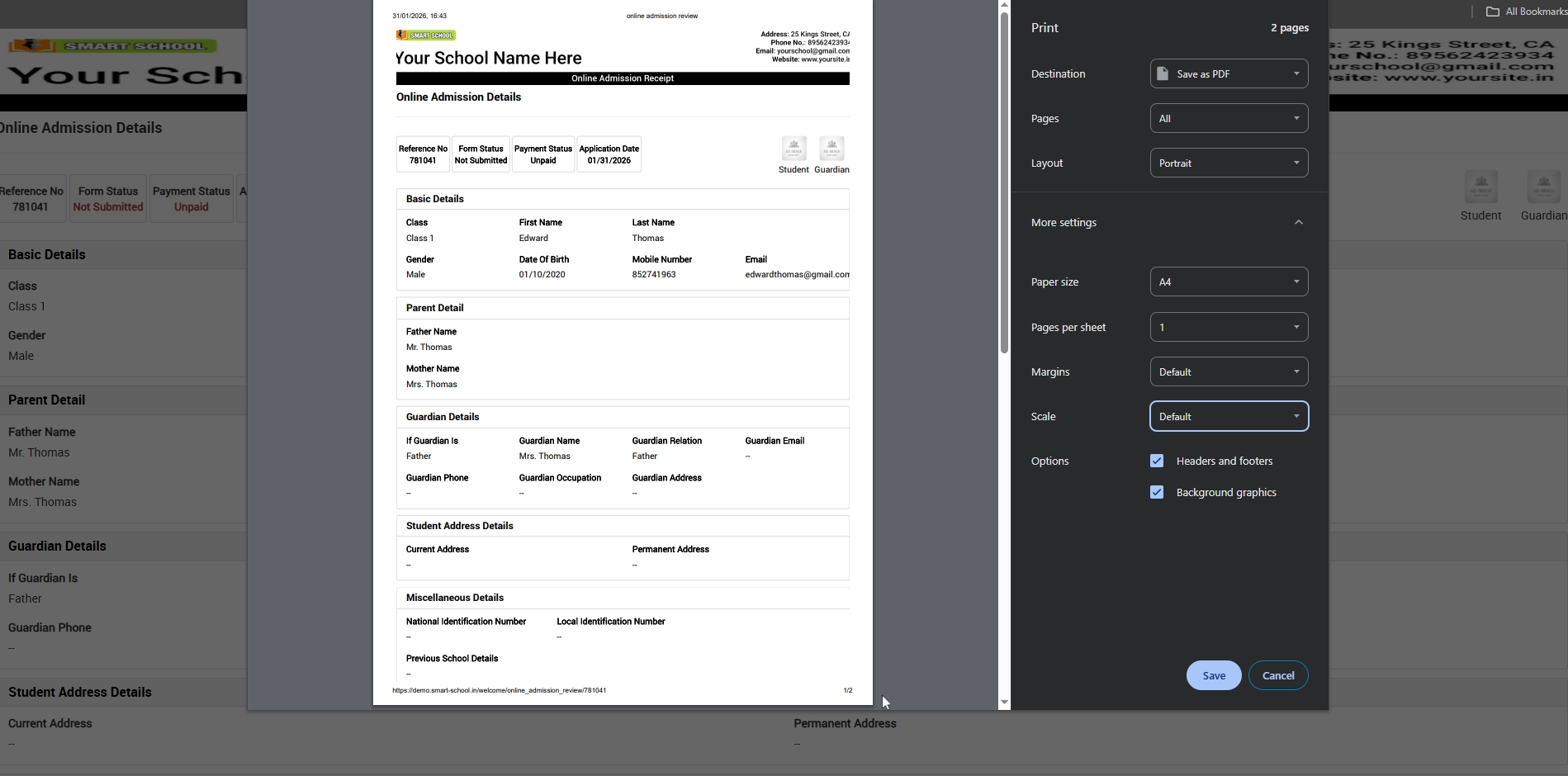To print online admission form receipt, go to Online Admission Review Details page and then click on the Print icon present on the top of the page.