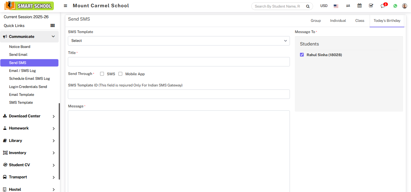 To send SMS today's birthday, click on the Today's Birthday tab present at top right corner of the page then enter the details message SMS Template, Title, Send Through, Message and Message To and click on Send or Schdule button and click on submit button.