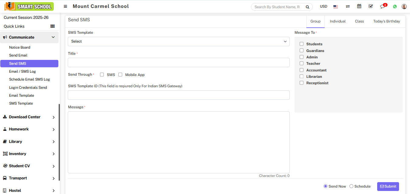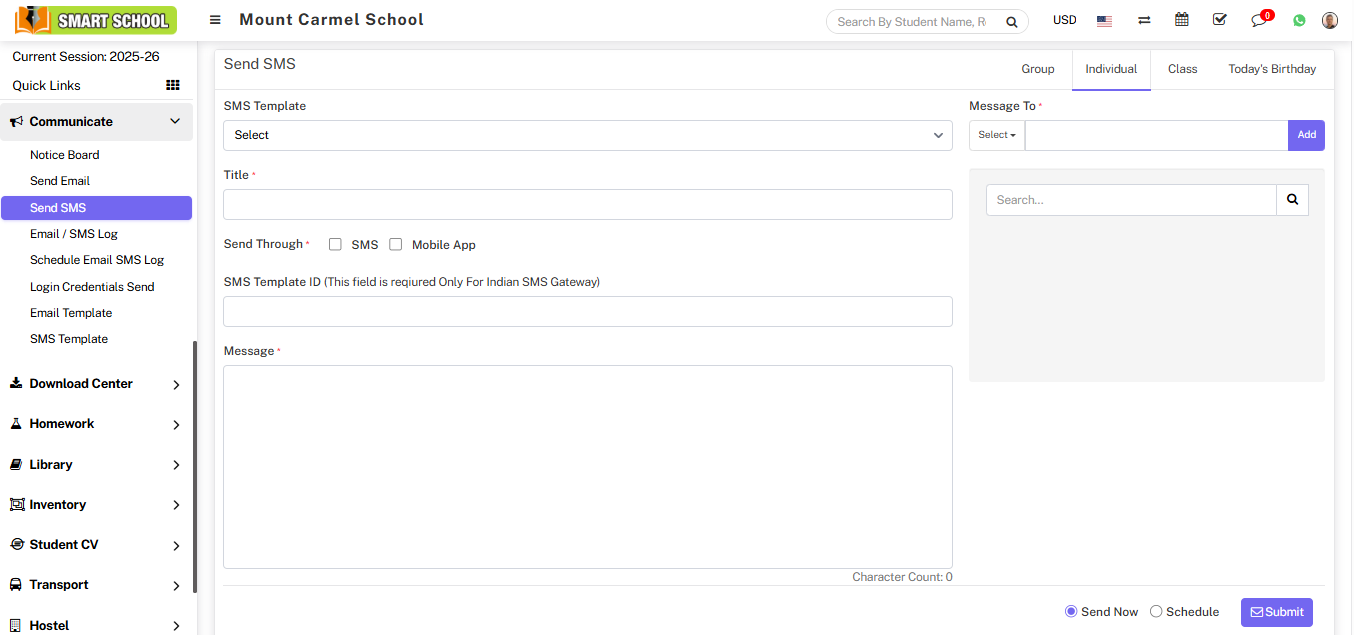 To send SMS individual, click on the Individual tab present at top right corner of the page then enter the details message SMS Template, Title, Send Through, Message and select Message To (Select the group of the person to whome you want to send email and then search for the member name in the textbox and to add more students click on the add button) and then click on Send or Schdule button and click on submit button