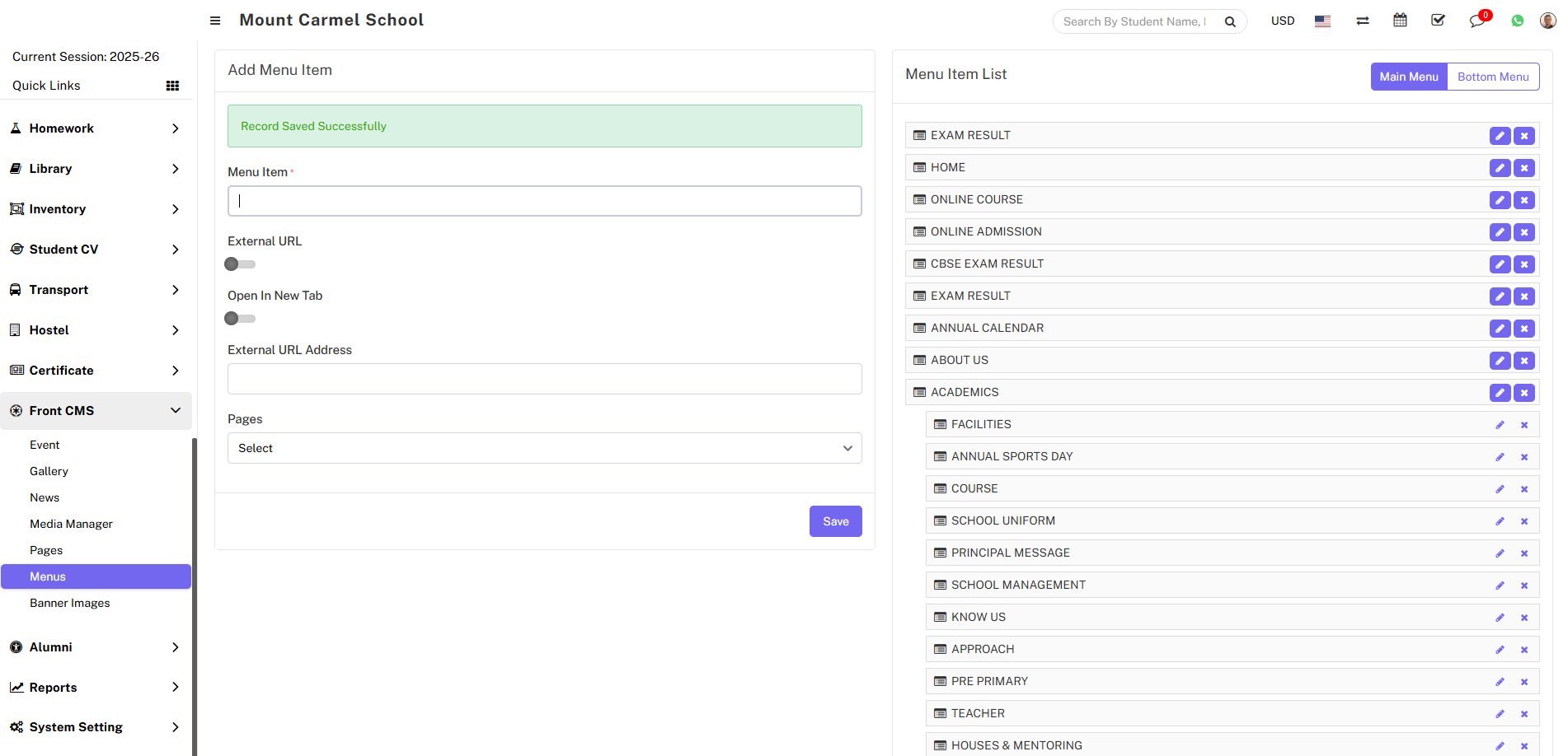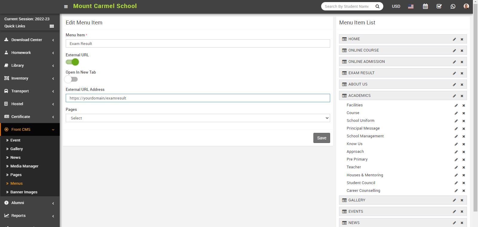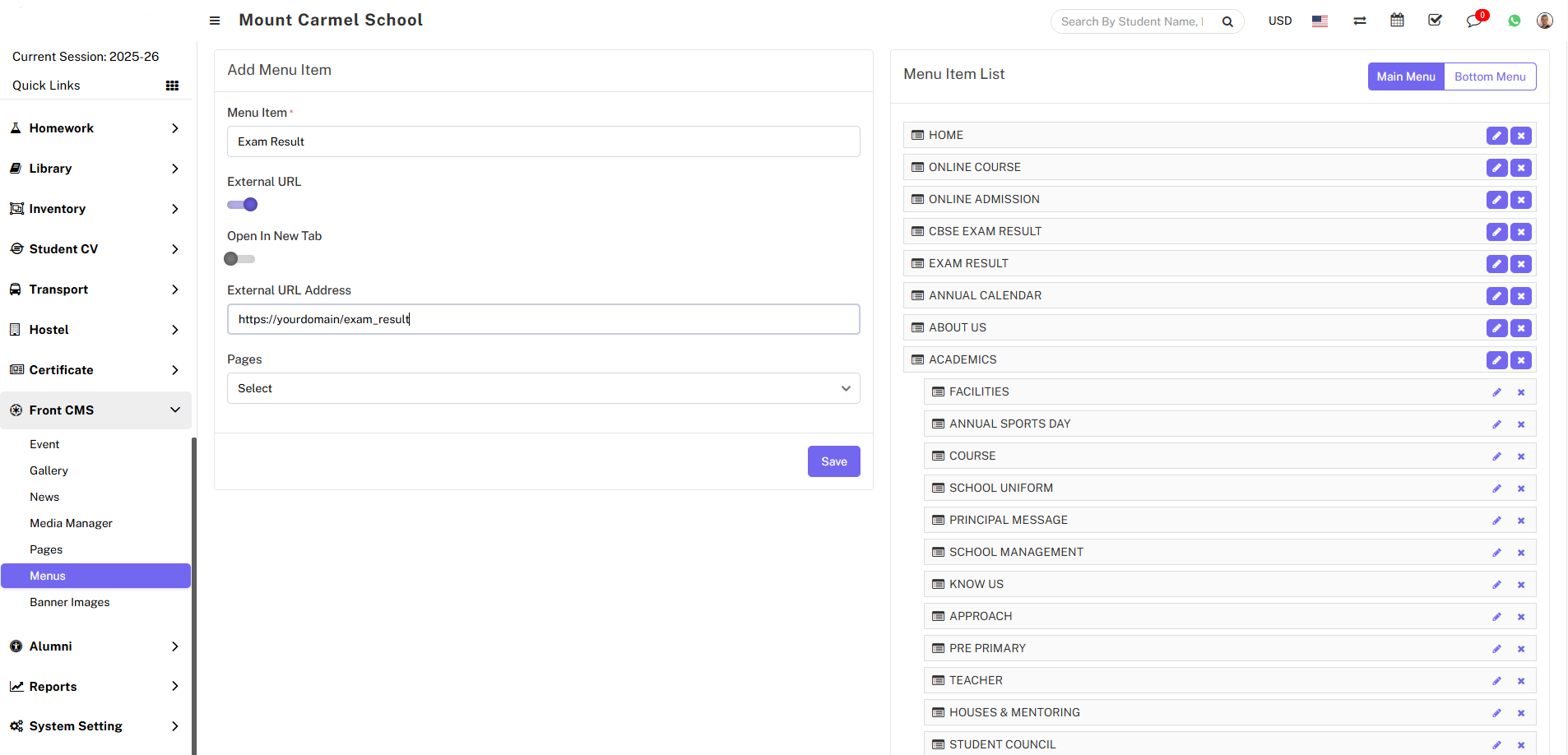For Example - In Menu Item enter Exam result, enable External URL toggle button, disable Open in New Tab, enter External URL Address, Pages drop down don’t select any dropdown then click on the save button.