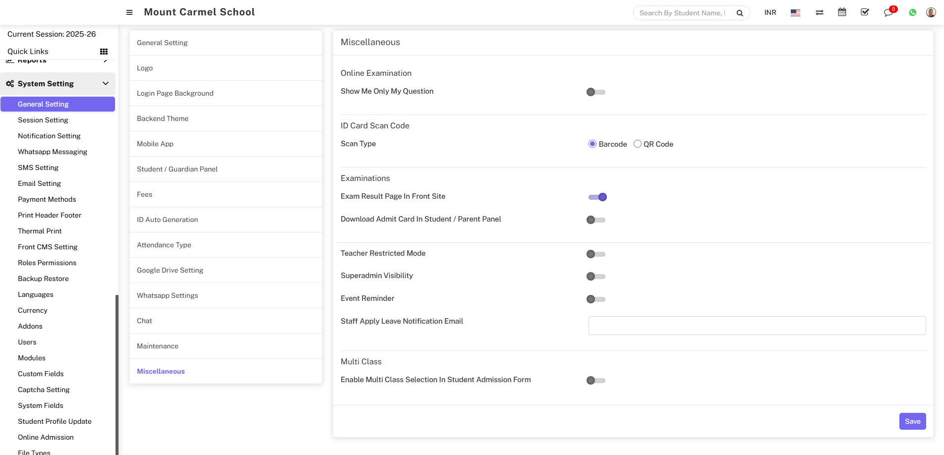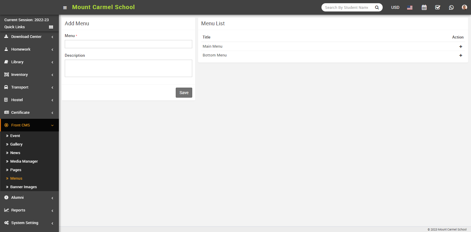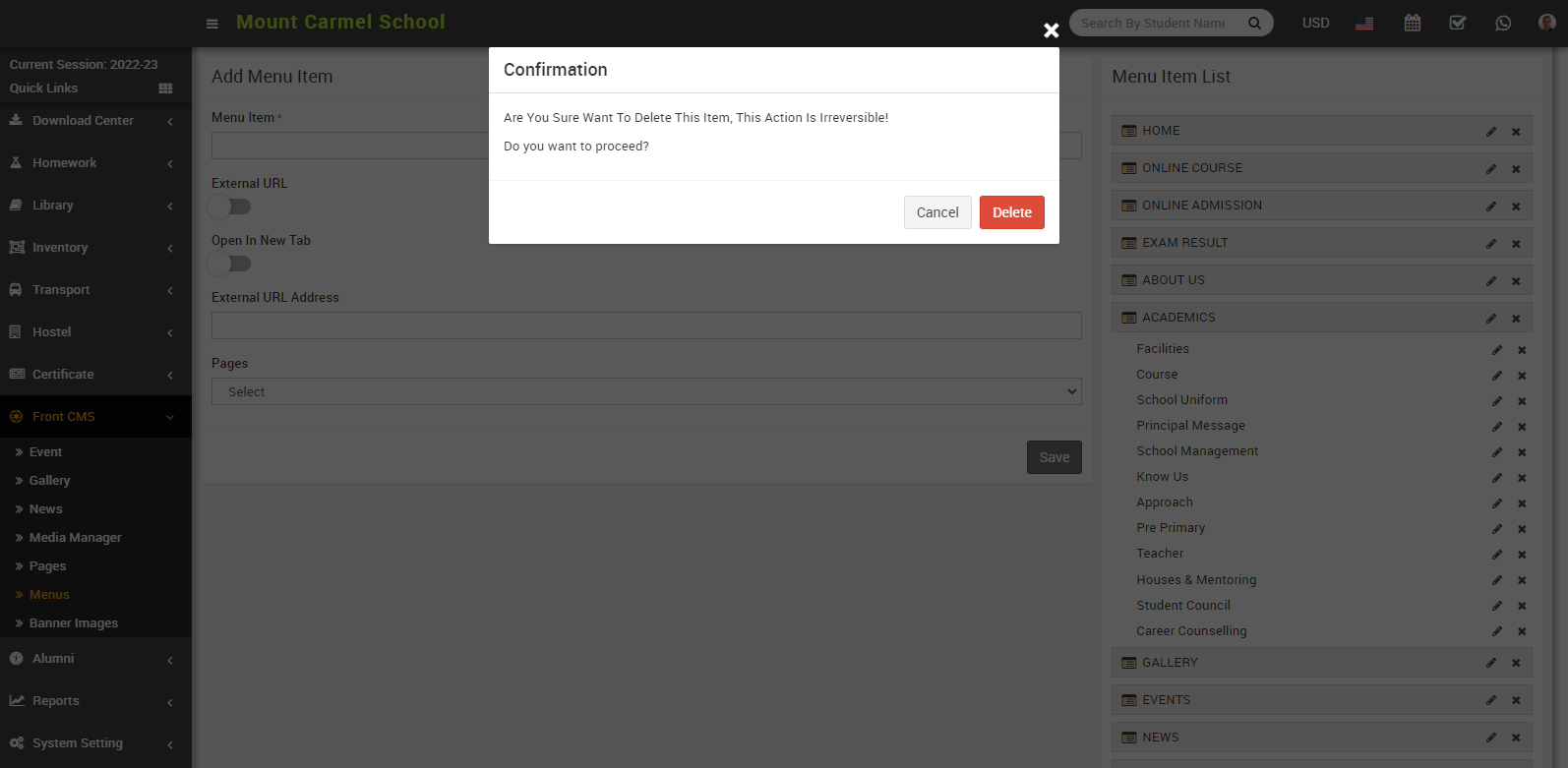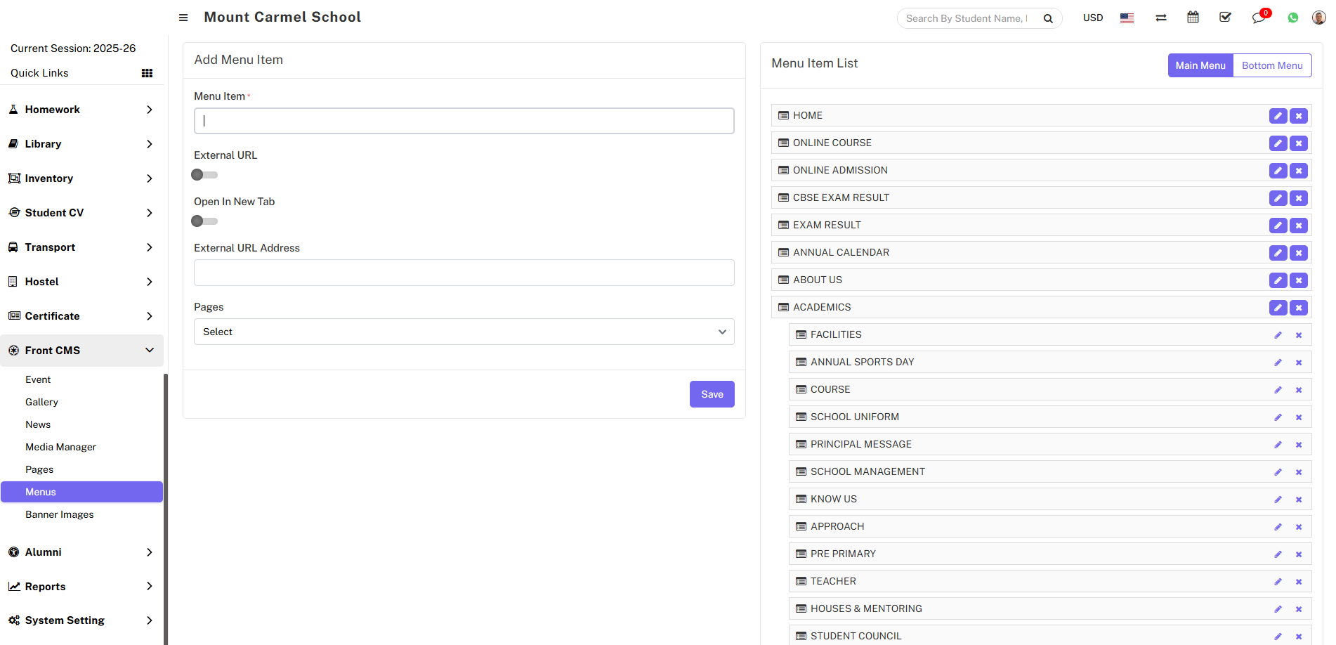 For Example - In Menu Item enter Exam result, enable External URL toggle button, disable Open in New Tab, enter External URL Address, Pages drop down don’t select any dropdown then click on the save button.