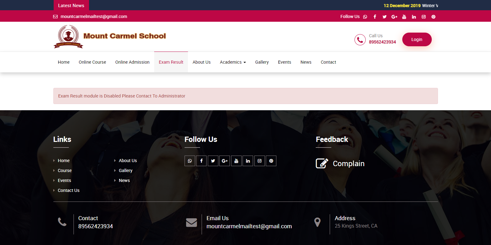 When you visit Soft School's front page, when you click over the exam result module you will notice the message as “Exam Result module is Disabled Please Contact To Administrator".