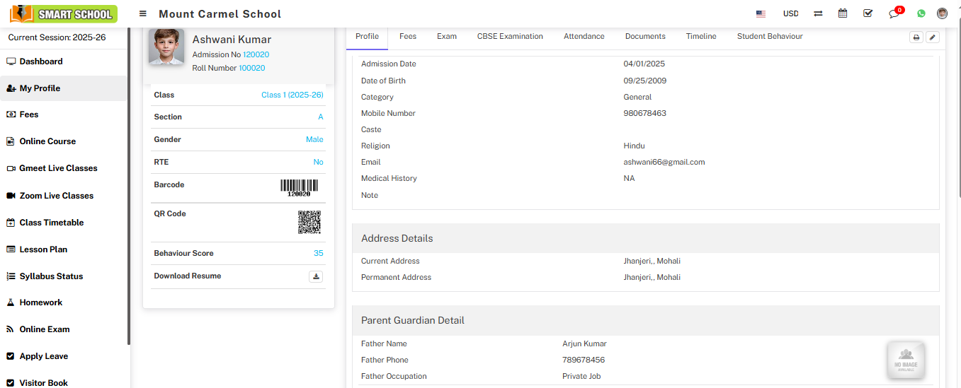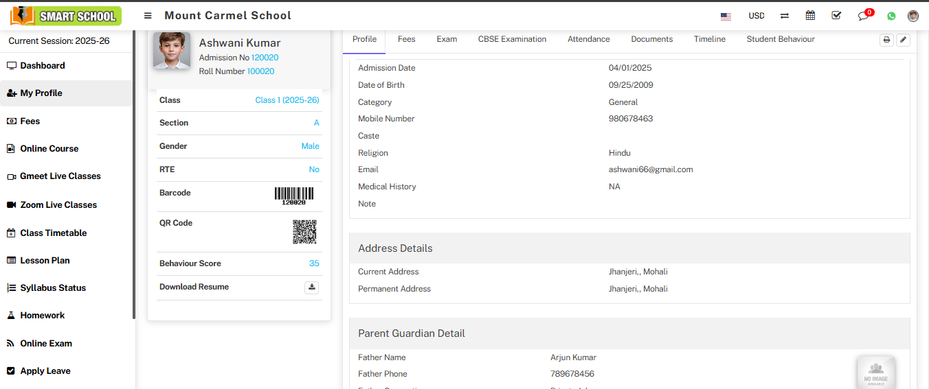 Profile: In the Profile section, you can view all the relevant details of the student.