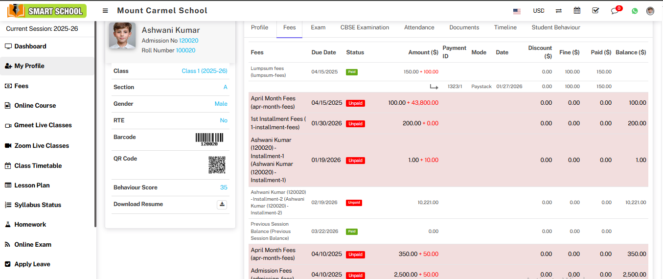 Fees: In the Fees section, you can view the student's fees including transport fees, and their payment status which can be paid, unpaid, or partial.