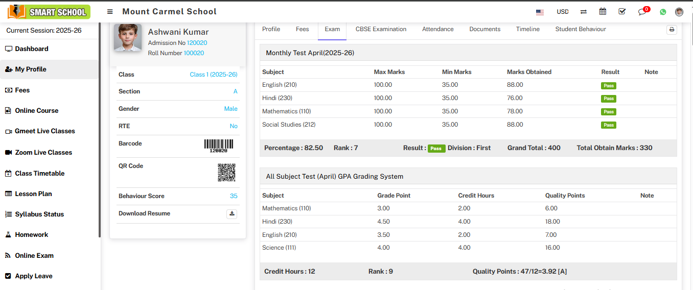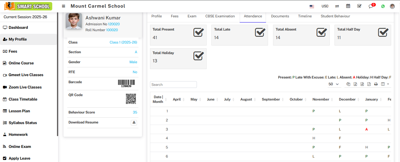 Attendance: In the Attendance section, you can view the student's attendance for the current session.