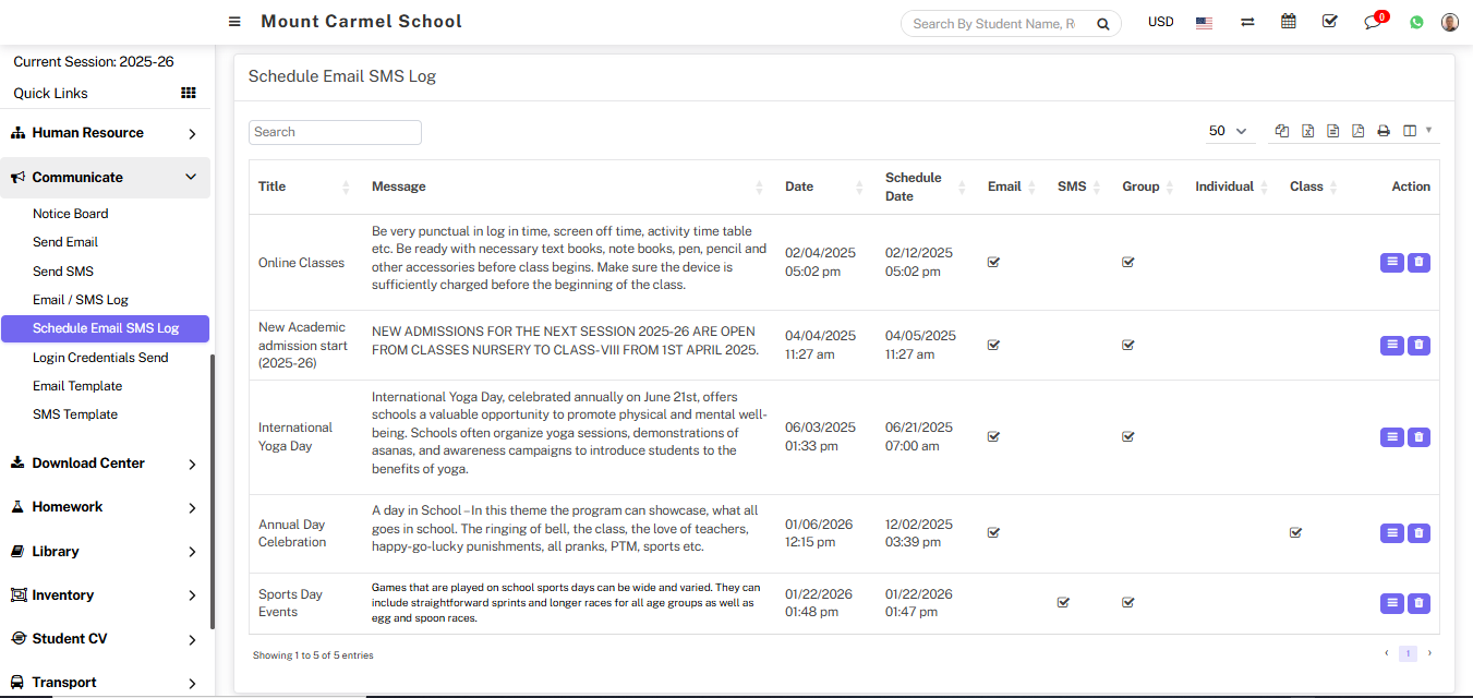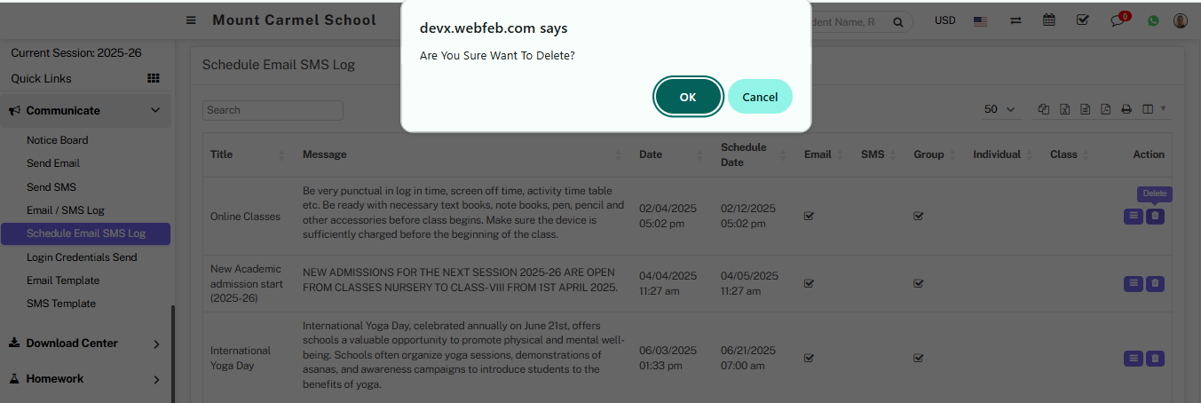 To Delete them, simply click on the Delete icon in the Action column, and your schedule email sms will be successfully deleted.