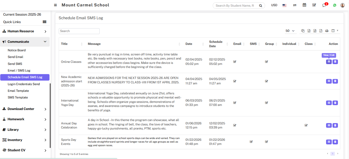 To view the Schedule Email SMS Log, go to Communicate > Schedule Email SMS Log; here you can view the entire Schedule Email SMS Log.